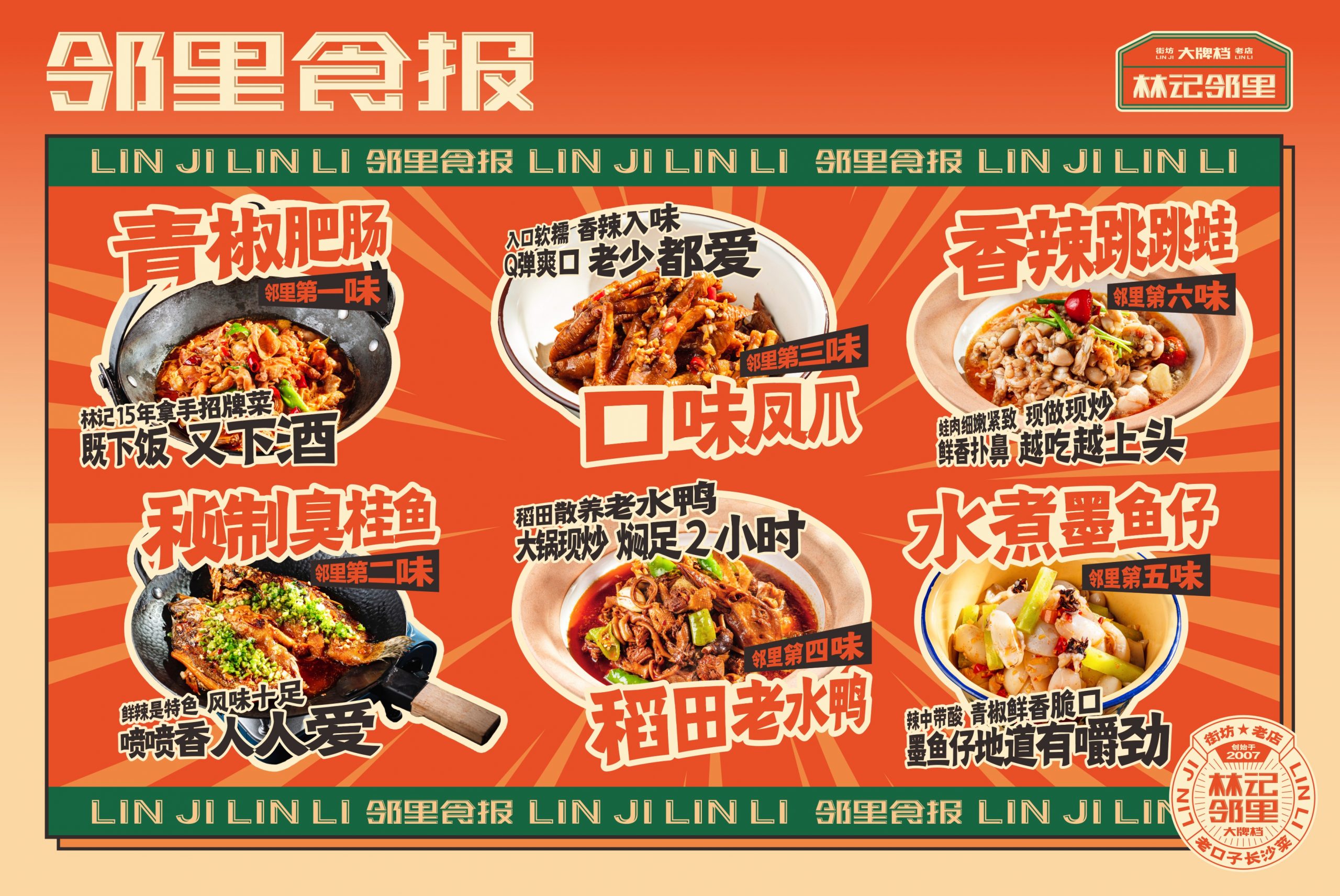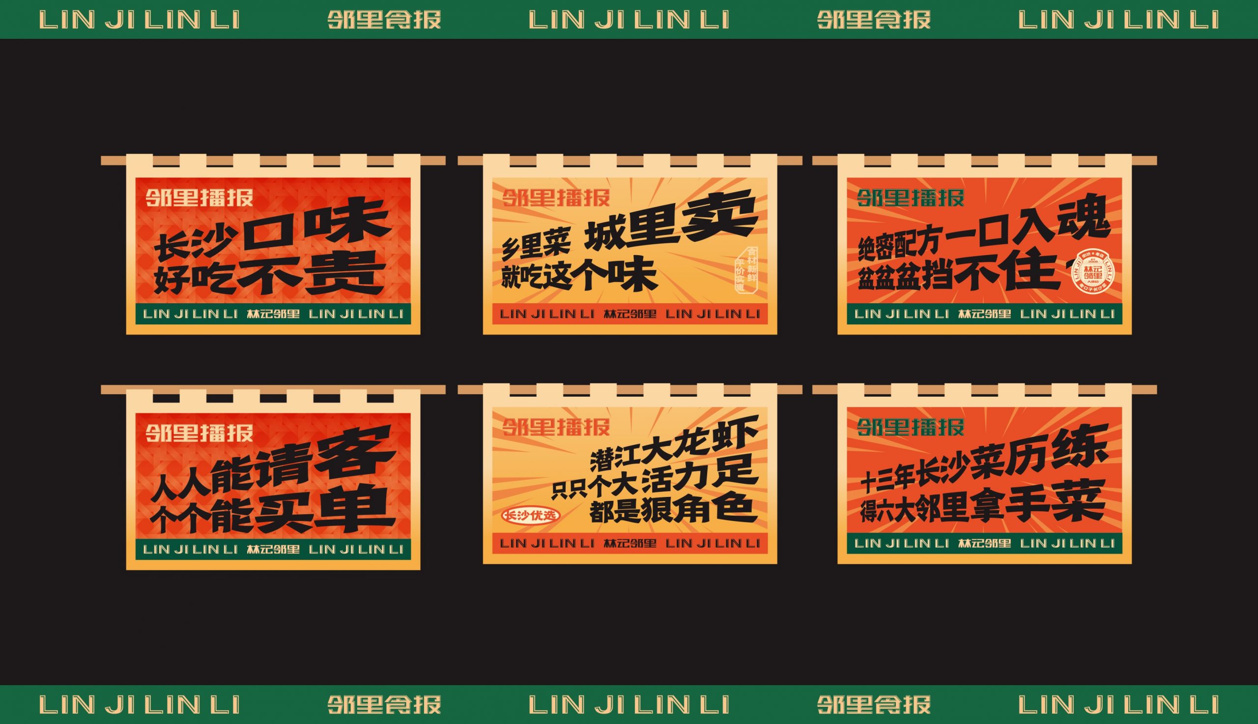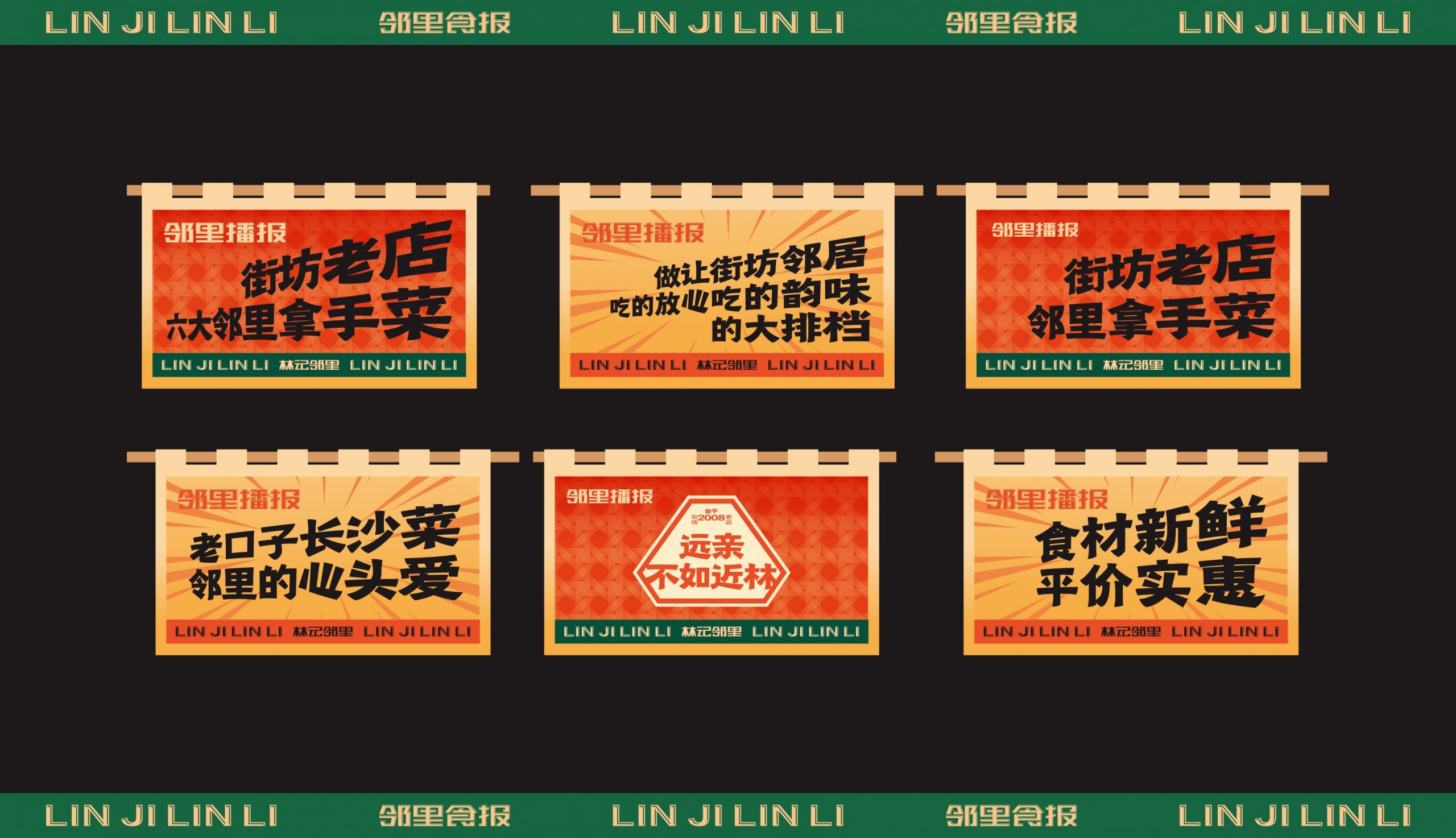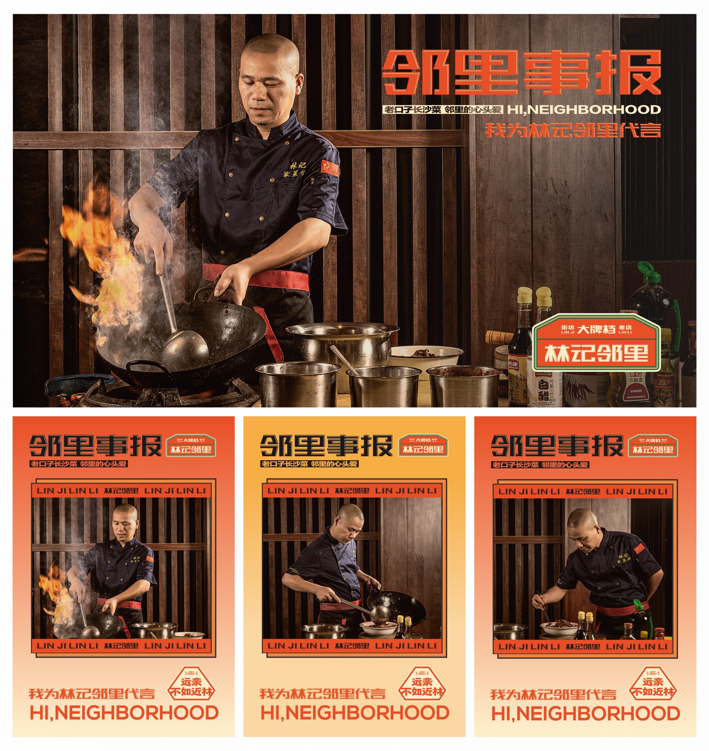 从品牌的社区餐饮商业定位出发,取用邻里文化,作为代表品牌社区餐饮的优势。借力所处商圈的商业优势,将林记的核心产品“家常菜”板块更换为“夜宵”,配合相对应的文化表达。结合品牌营中晚餐与夜宵的全时段经营特性,做出全面思考,为品牌准确定位林记邻里大牌档。