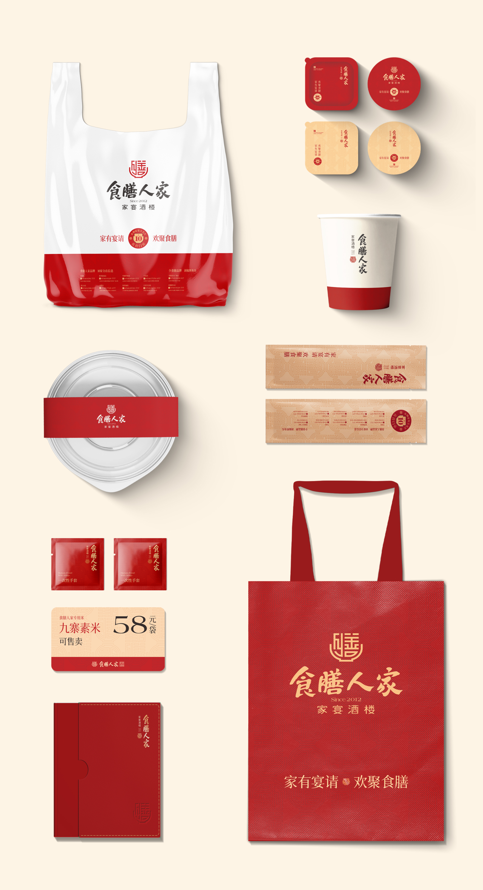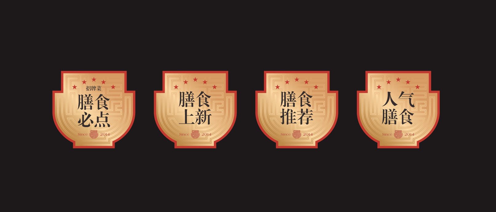 品牌LOGO从中文字笔画提取“膳”文字造型结合“食碗”元素进行设计,增添标志与行业属性的关联度。在颜色选择上,整体采用红色作为主色调,热闹、温暖的韵味直接传达顾客。