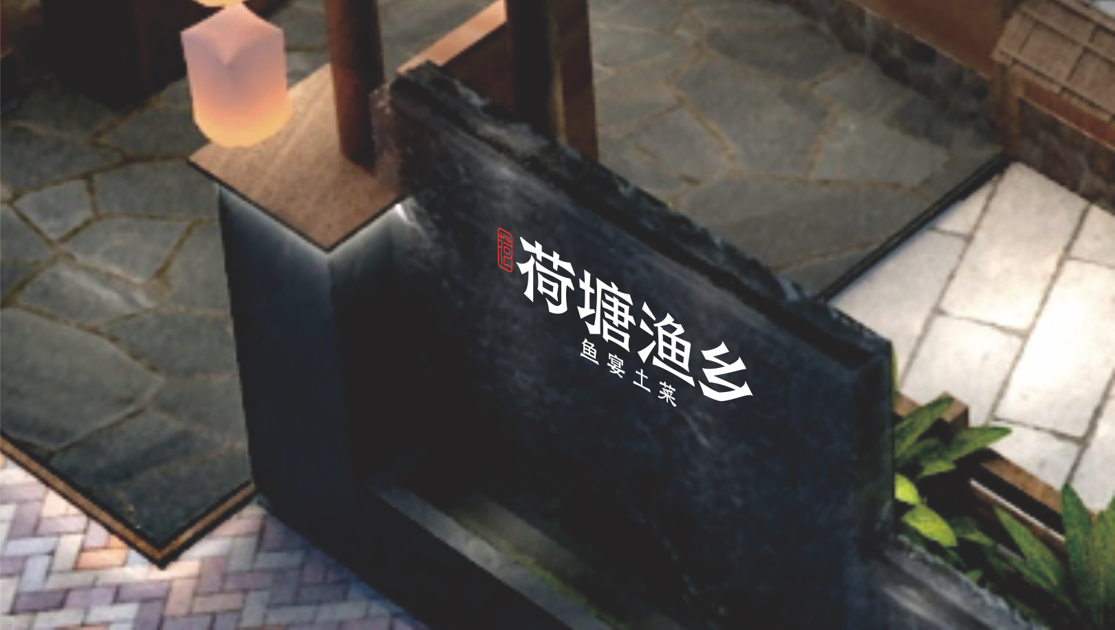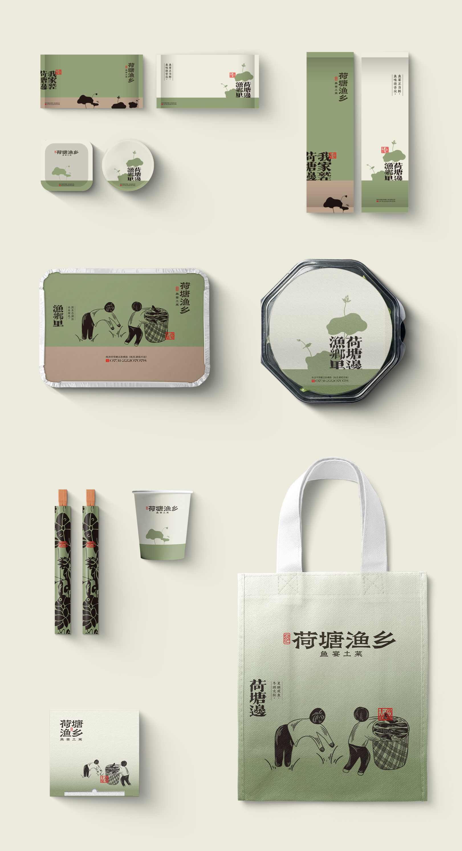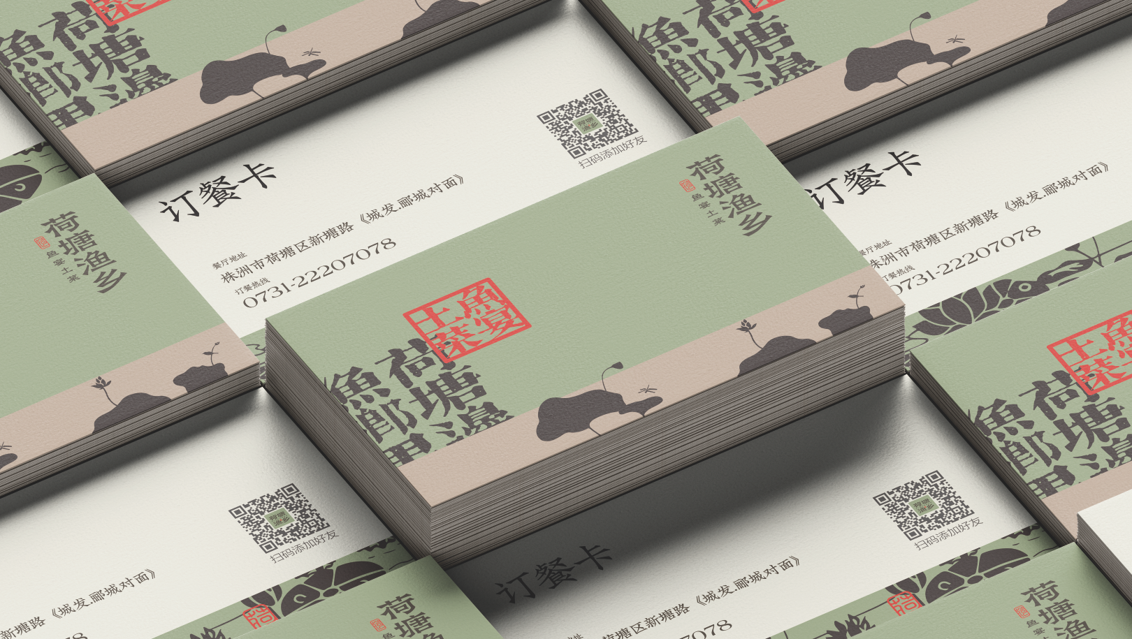 品牌名“荷塘渔乡”将招牌产品或品类的信息呈现其中,“荷塘”“渔乡”这些画面感的用词不仅从进店前便开始打造休闲自然的消费场景,为接下来的空间呈现预留想象空间,同时也将位于“株洲荷塘区人身边的鱼馆”,这一地理位置信息暗含其中。