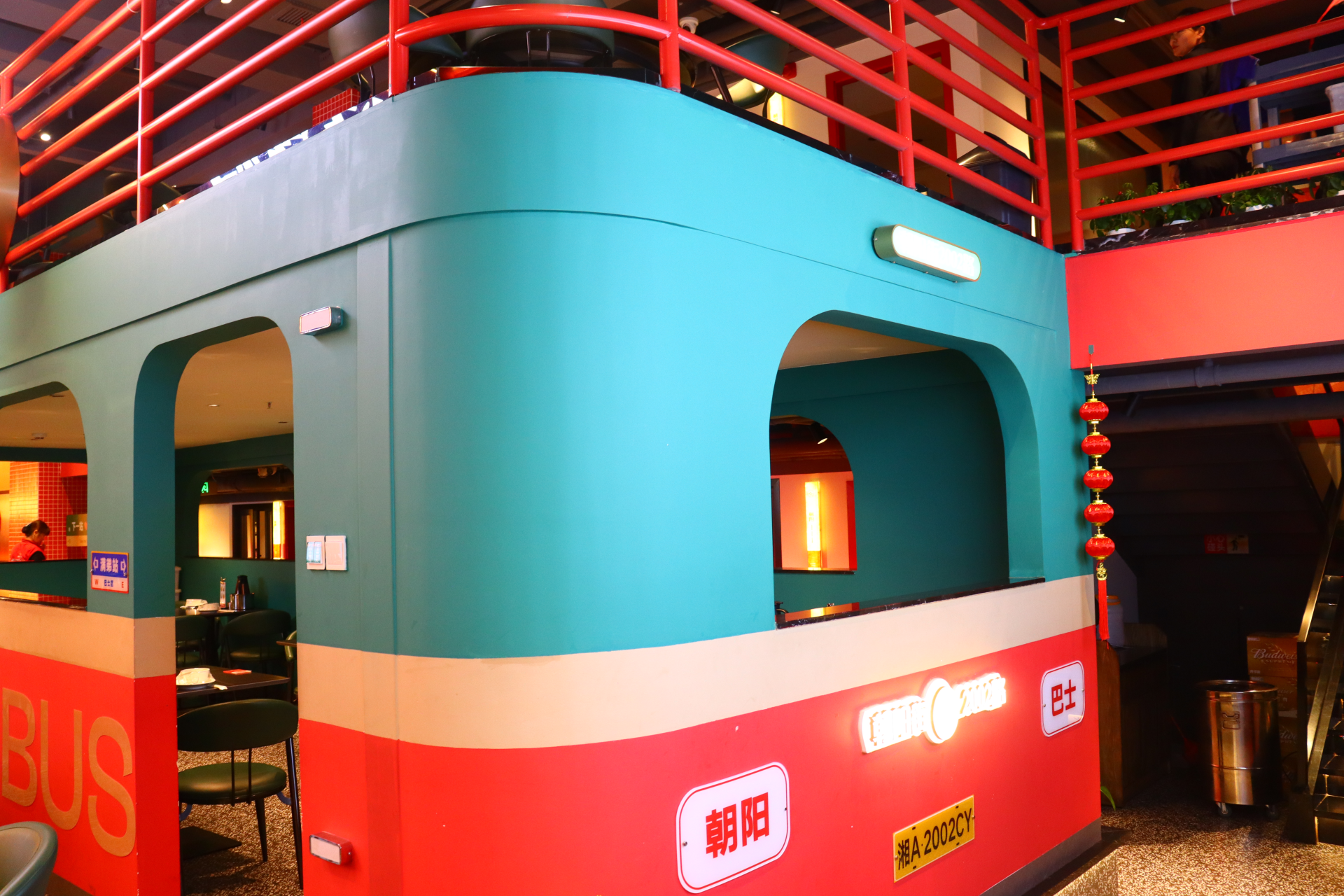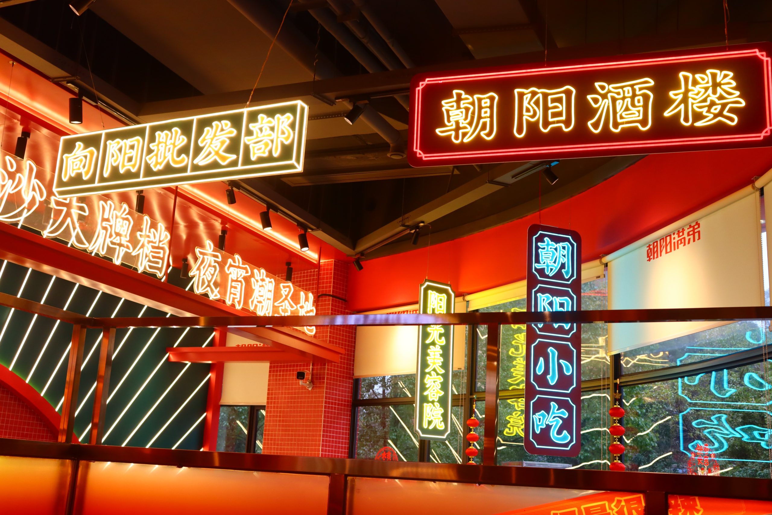 在空间设计中,我们同样希望以“街区”为核心创意,以东方之魂定义时尚格调。让品牌门店环境充满烟火气息,大巴车、太阳、霓虹灯等元素引发消费者的关注与兴趣,尤其是年轻人。同时各区域的命名也是结合现实名称,更加真实,如“朝阳收费站”、“酒楼”等。