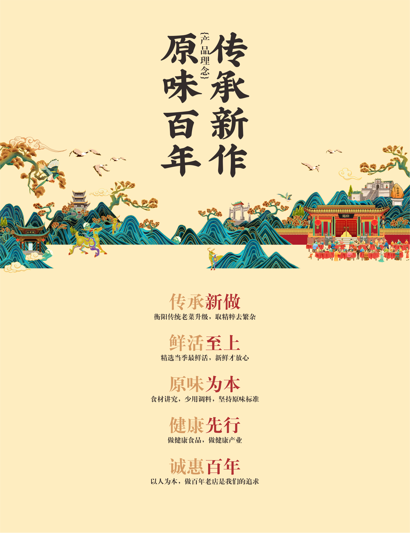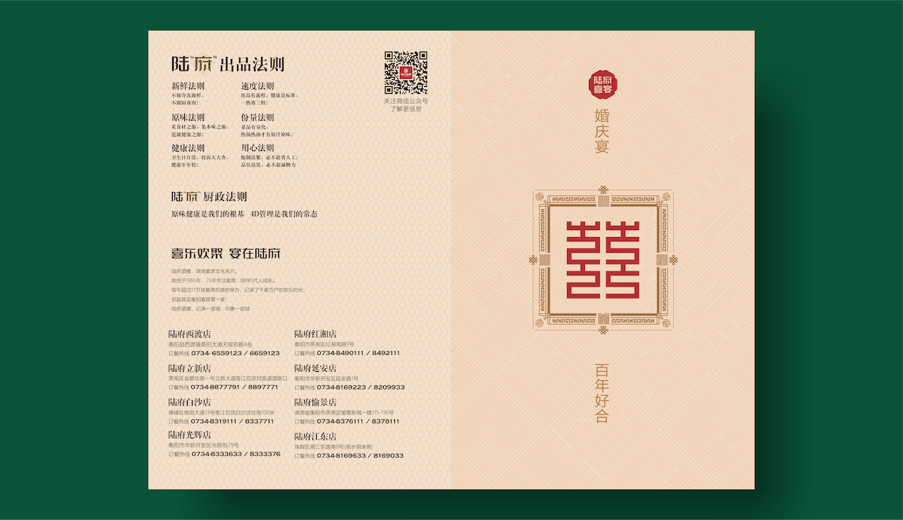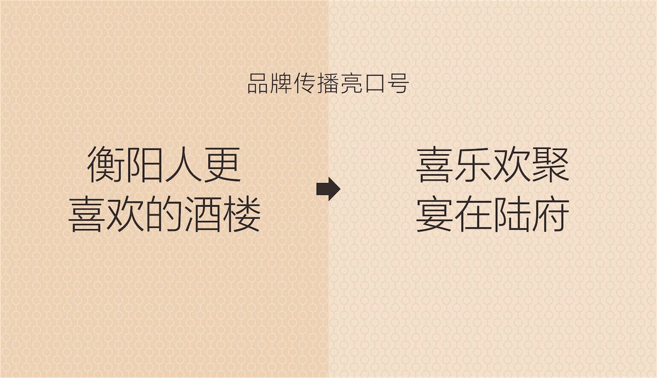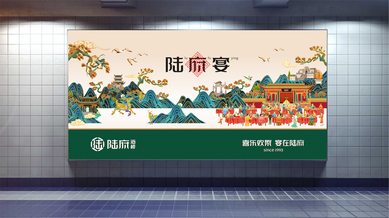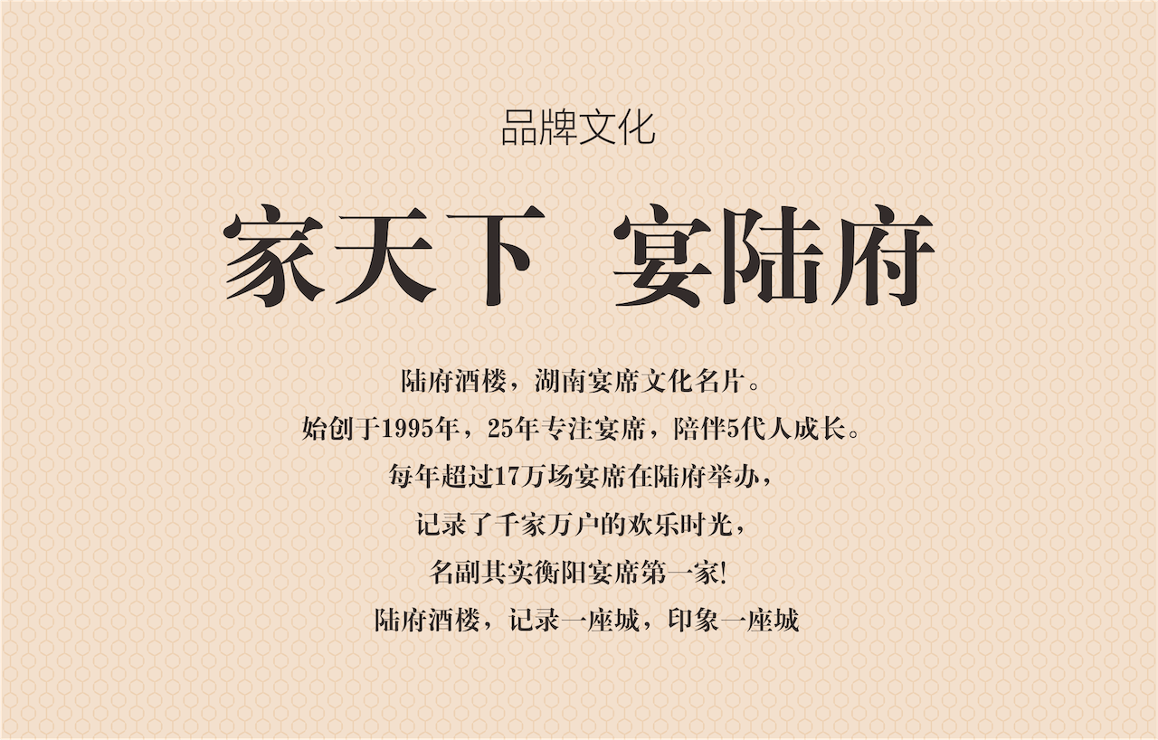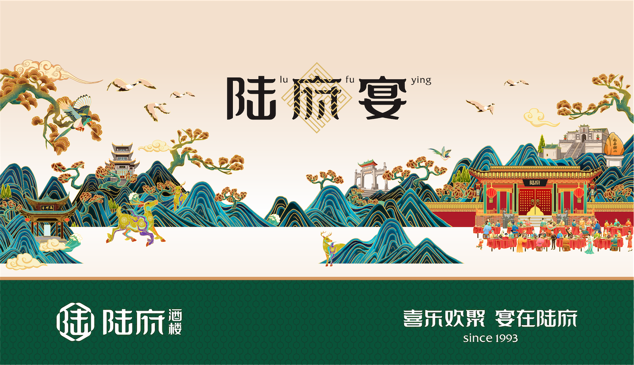 同时,为深入强化品牌整体感受与认知,我们在品牌主画面塑造中,将陆府与衡阳地标融合,结合宴席场景,帮助消费者深入理解陆府酒楼的品牌文化核心“家天下,宴陆府”。