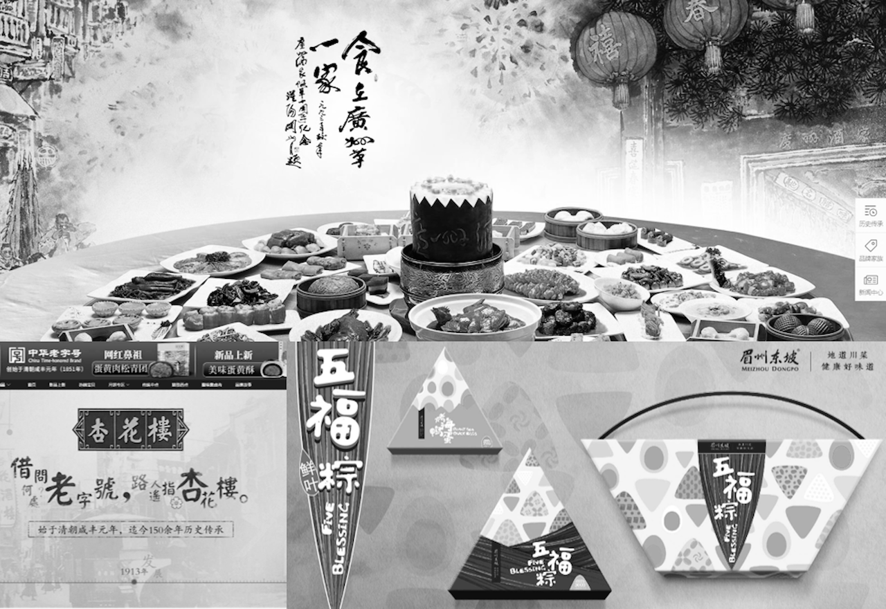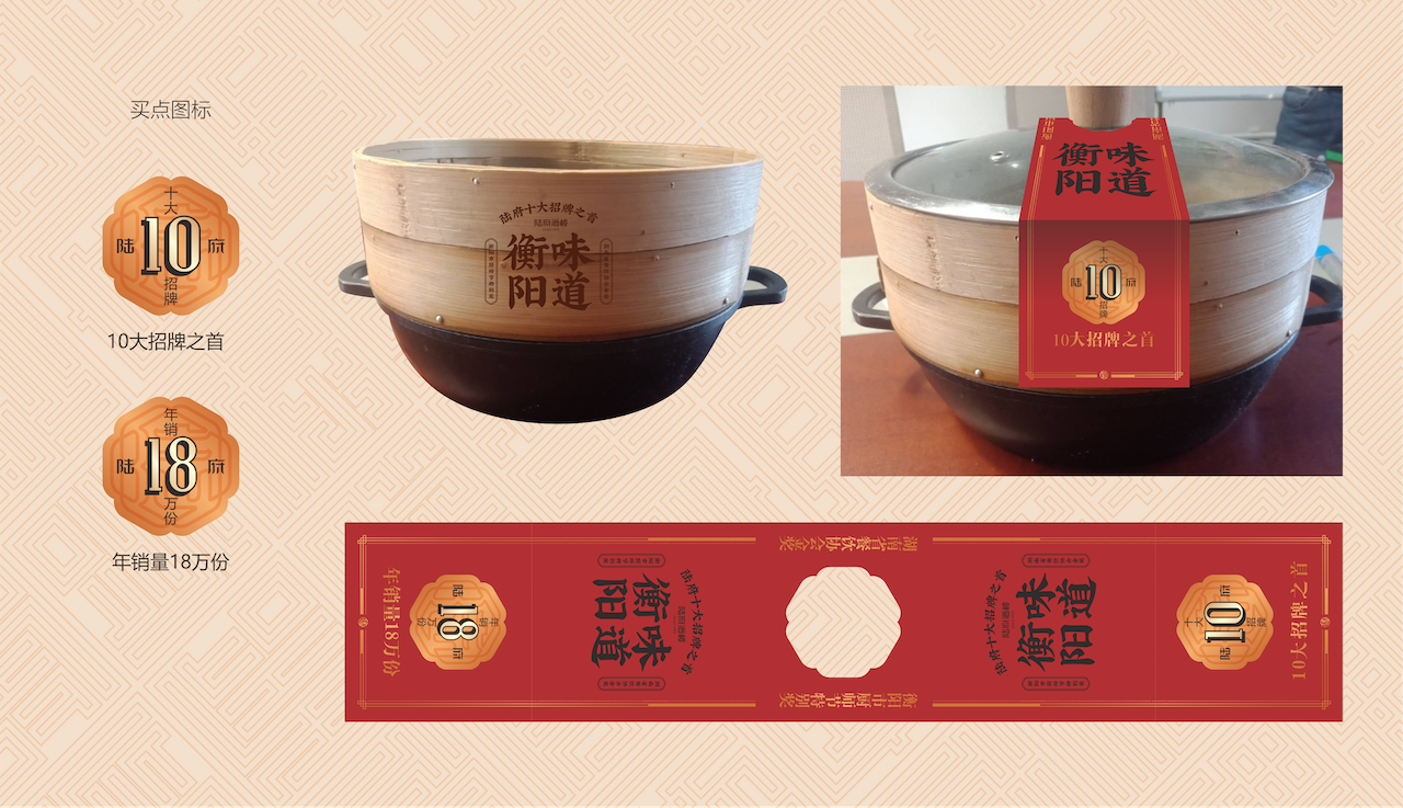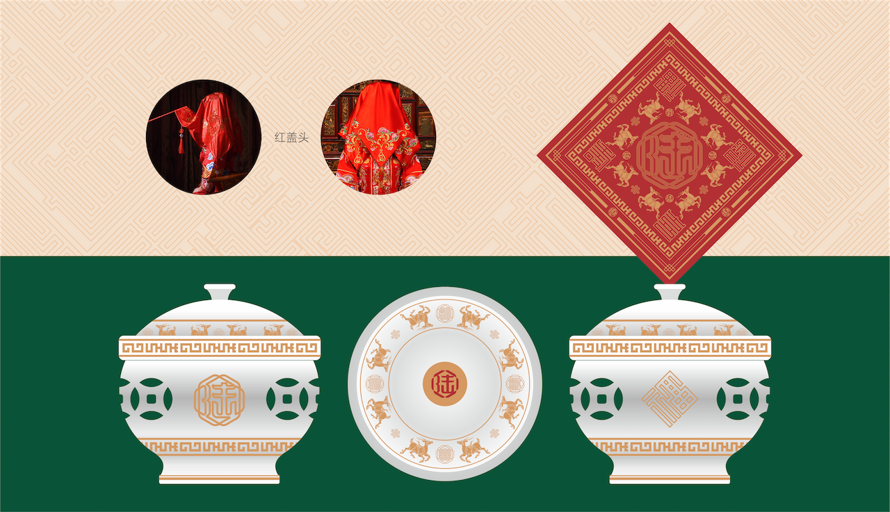 我们从牡丹、传统食盒、漆器、寿龟、窗棂抽离视觉主体元素,从府邸、门楼抽离文字造型,在整体造型中除了文化感以外,更多的表达品牌理念的延续:寓意六六大顺,家和万事兴。