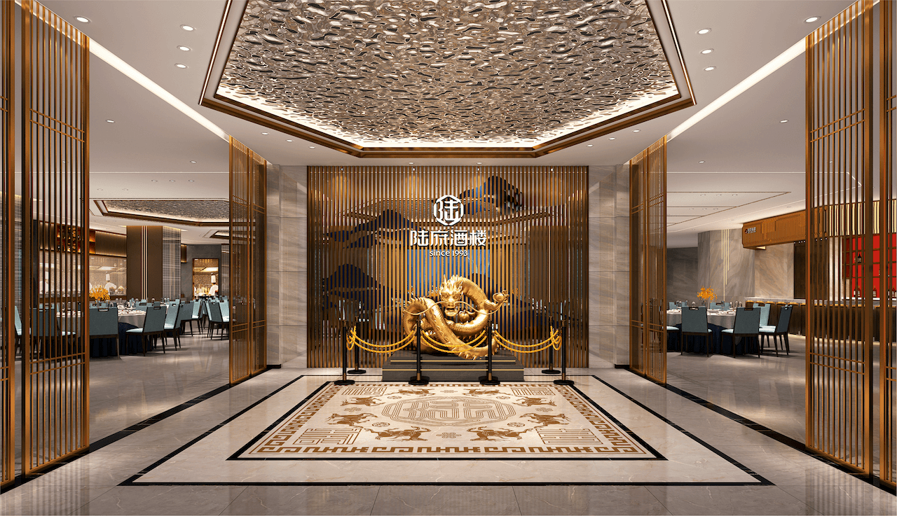 在陆府酒楼(红湘店)空间板块整体升级的过程中,如何将品牌巧妙且合理的融入到空间中,是当时所面临的难点,工艺、质感、材质、规格、亮化等等一系列因素都将影响最终的执行实施的效果。
