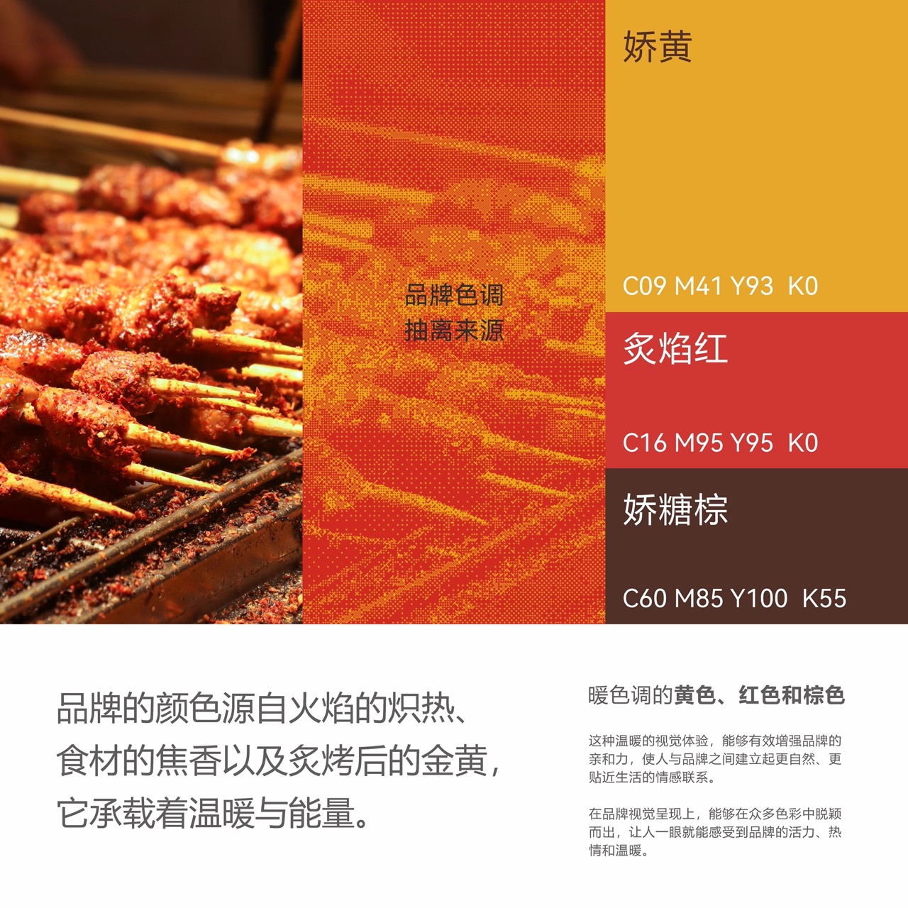 消费者对品牌的第一感觉是颜色,选对颜色能提高品牌80%的识别度,由烧烤与炭火提取出来的品牌色,强化“原身”基因;