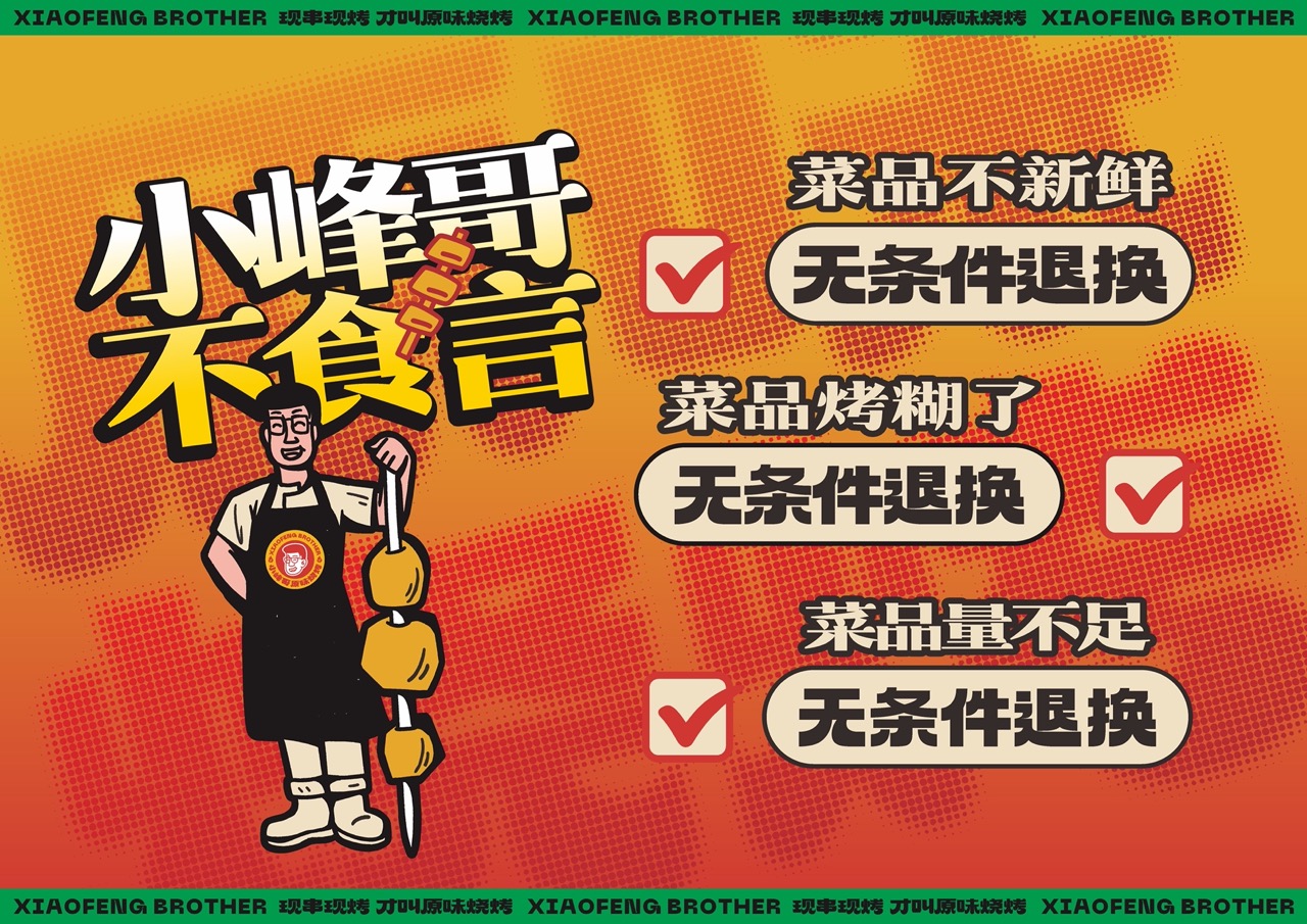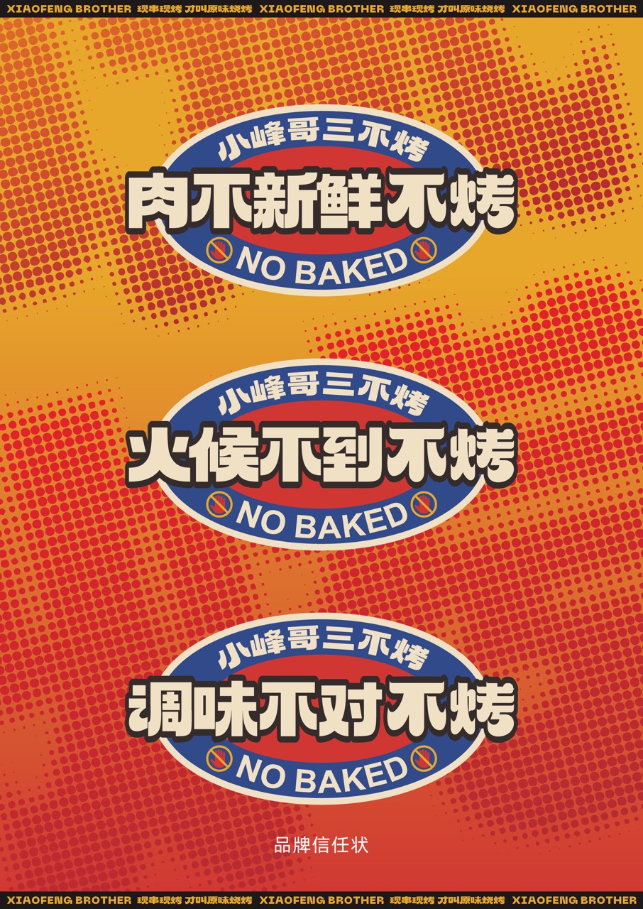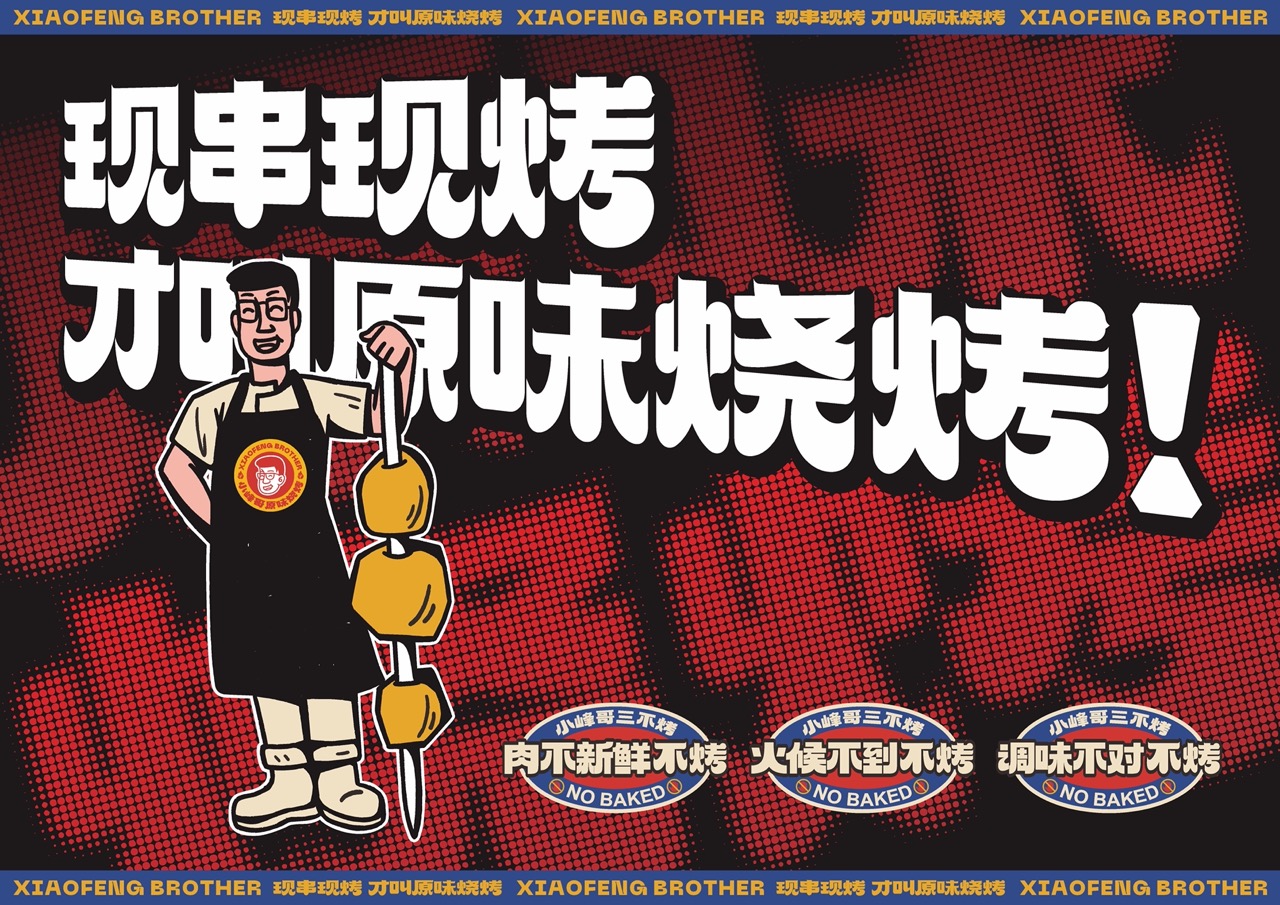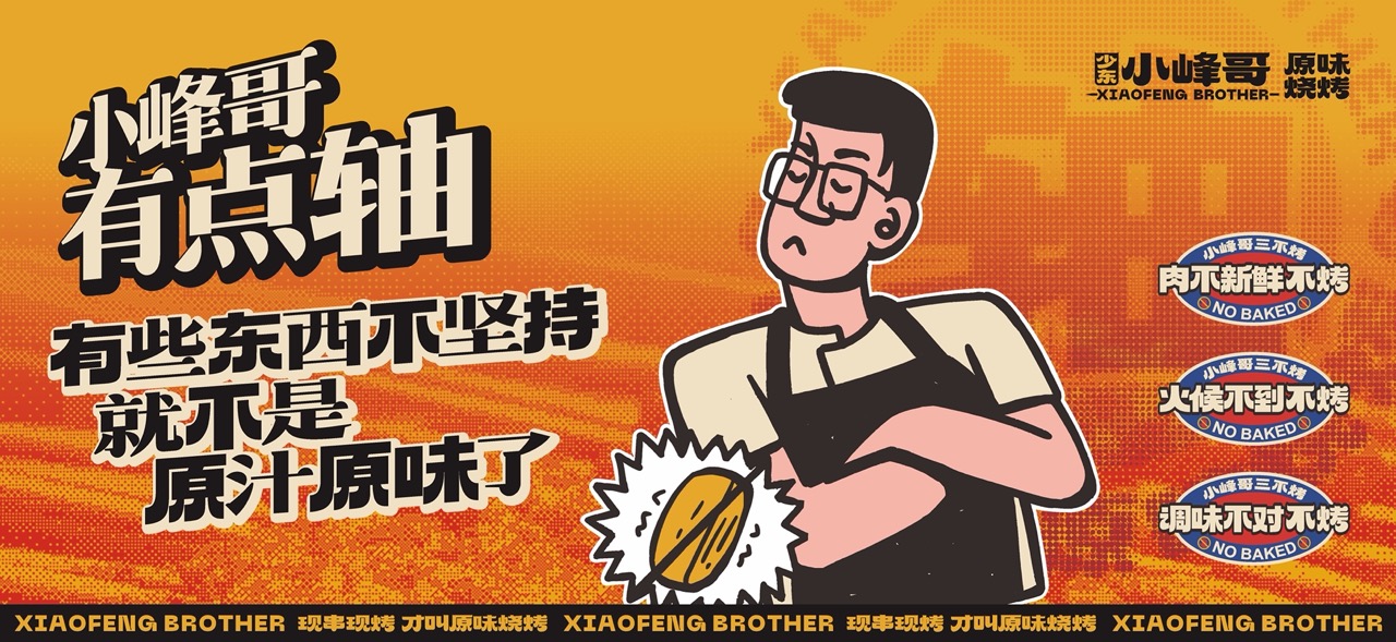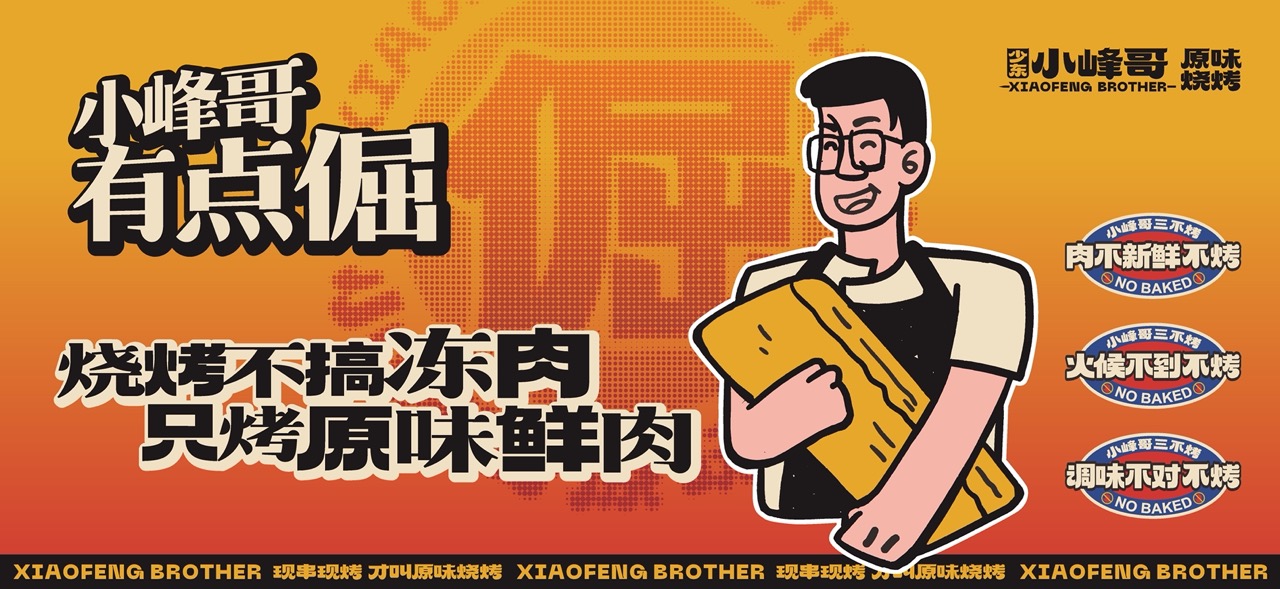 品牌创始人是品牌最好的代言人。我们将小峰哥人物形象进行概念抽取,设计出专属创始人头像徽章+“小峰哥有点轴”等系列标语(如“烧烤不搞冻肉,只烤原味鲜肉”),强化人格化信任。