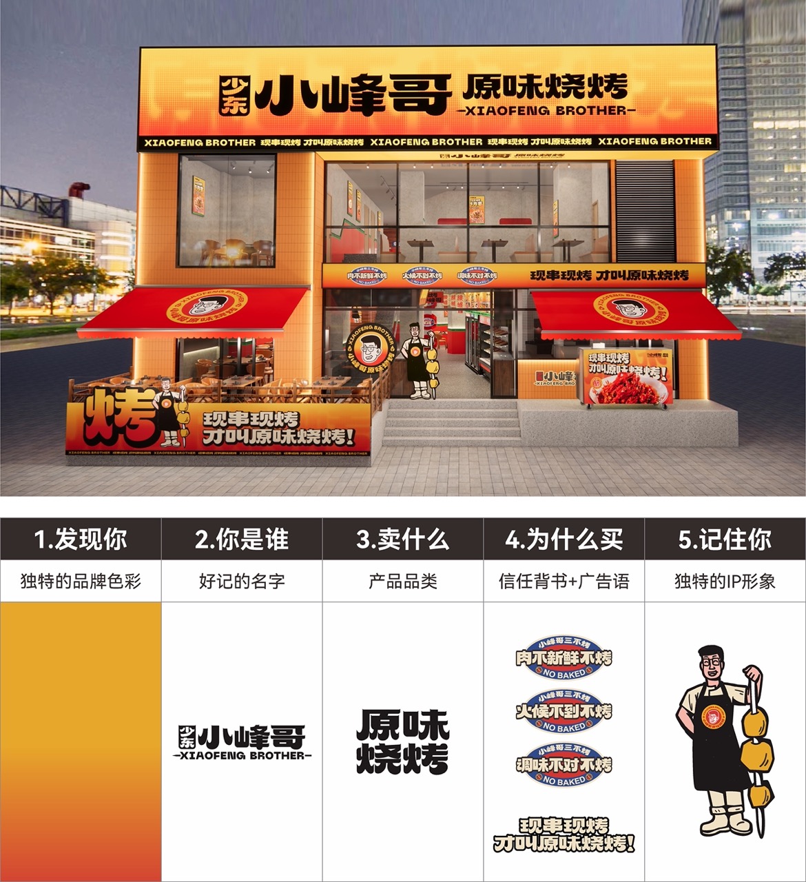 名字取得好,传播成本少。好名字三要素:易懂、易记、易传播。“少东小峰哥”+“原味烧烤”,关联品牌IP的同时直接说明品类属性,一看便知吃什么。