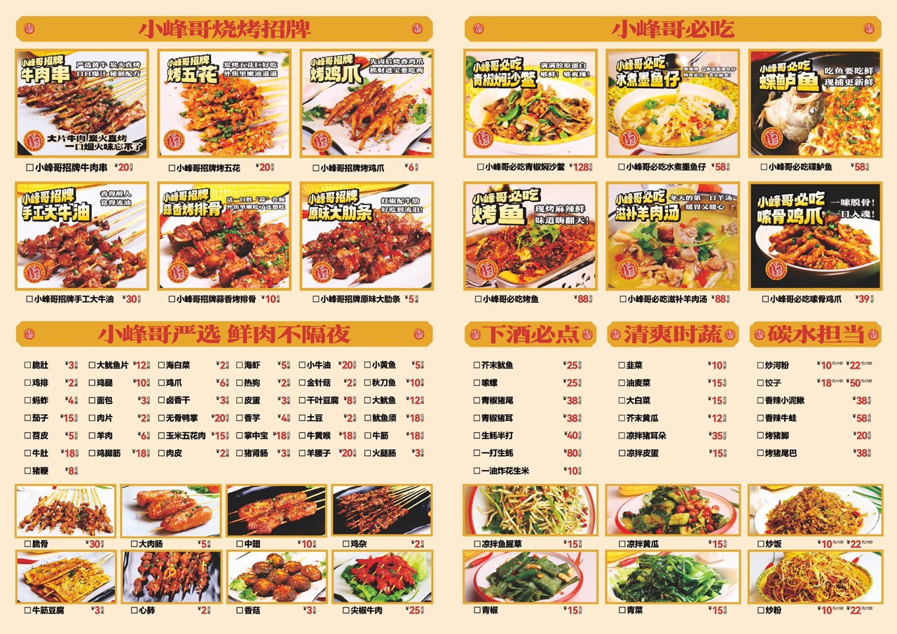 小峰哥原本的SKU庞杂、产品系列不清晰。我们围绕核心亮点重新进行产品定位,“主+辅+配”结构:6大王牌烧烤为主,6大必吃炒菜为辅,饮品为配,构建完整的产品矩阵,产品叠加小峰哥严选背书,让“放心”可感知。