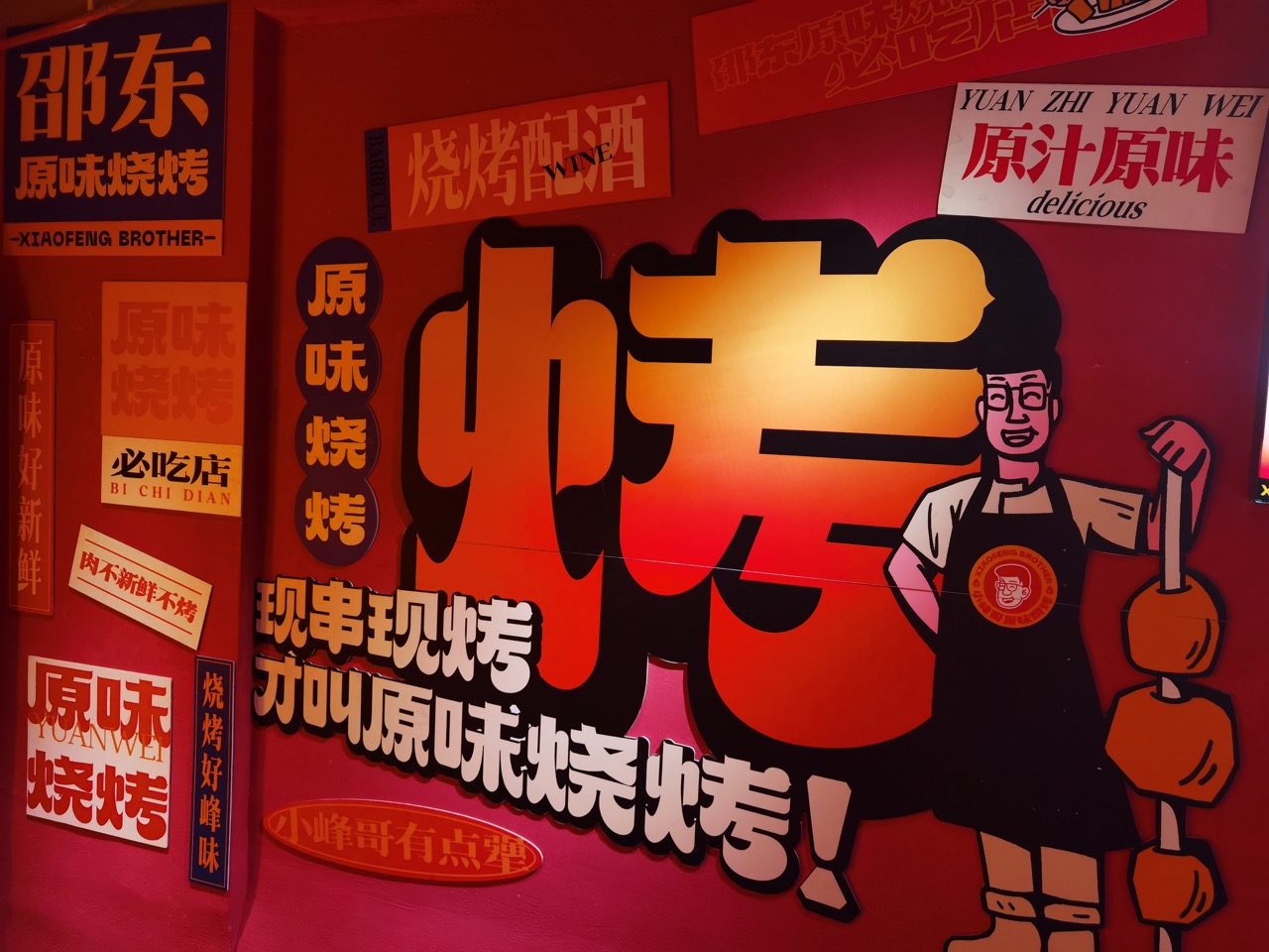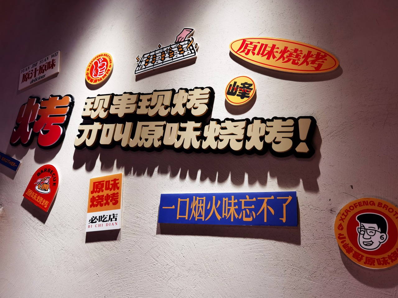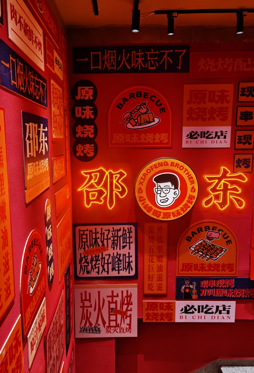 从“摊”到“据点”的进化,将“三不烤”原则、品牌故事在门店空间集中展示,形成沉浸式品牌教育。原味文化+混泥土元素+复古灯箱,还原邵东复古烟火气。